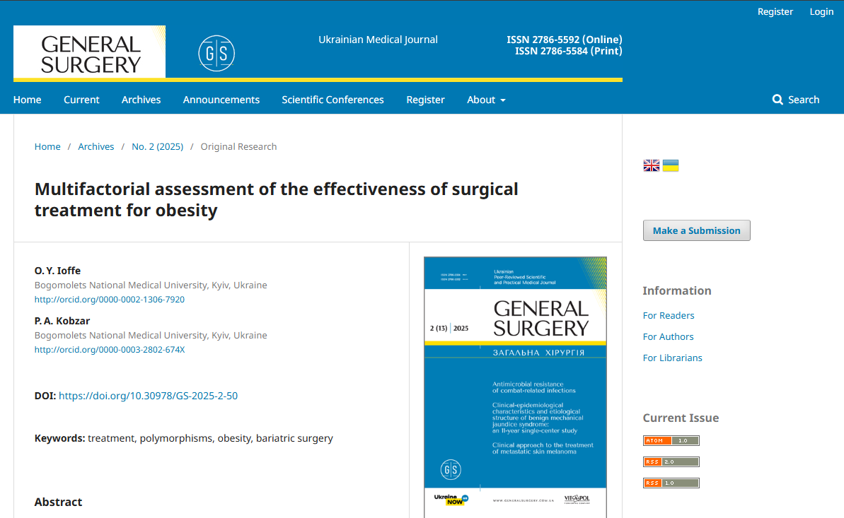 Бібліографічний опис: Ioffe O, Kobzar P. Multifactorial assessment of the effectiveness of surgical treatment for obesity. ЗХ [Internet]. 2025Jul.31 [cited 2025Sep.29];(2):50-5. Available from: http://generalsurgery.com.ua/article/view/336162