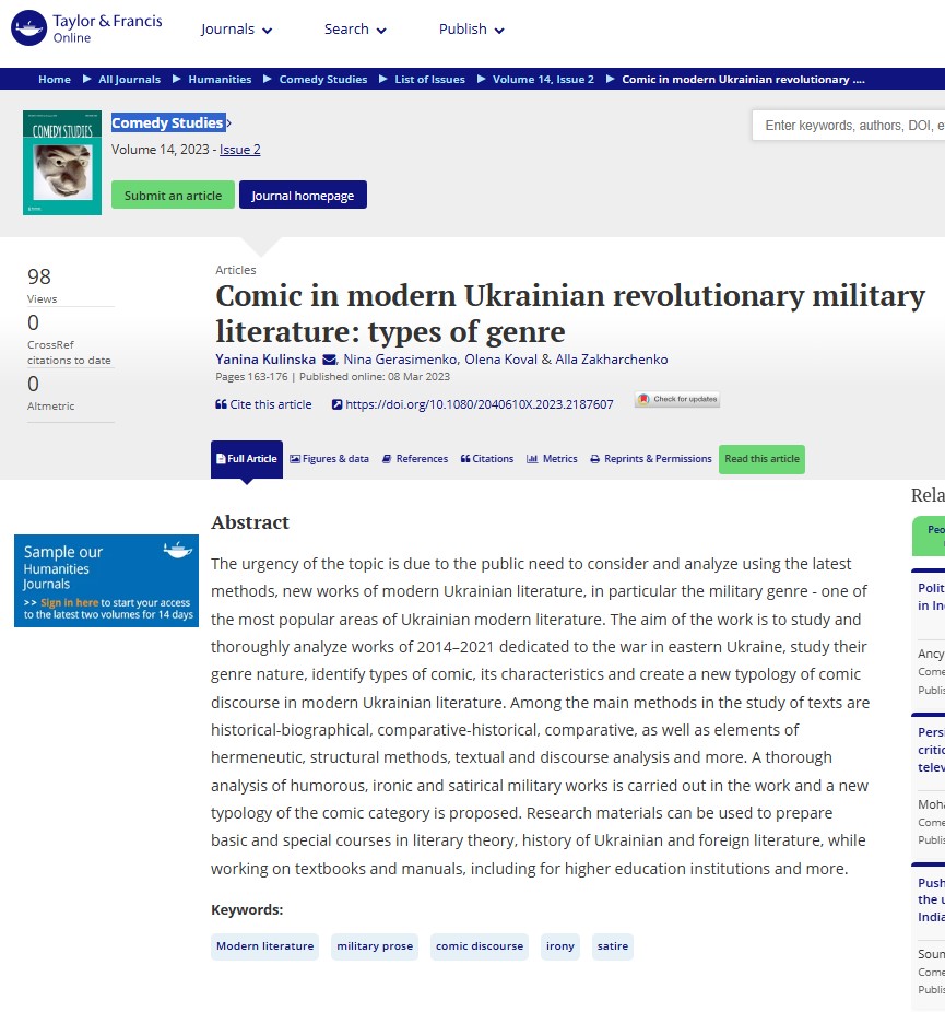 | Ключові слова: | Modern literature, military prose, comic discourse, irony, satire |