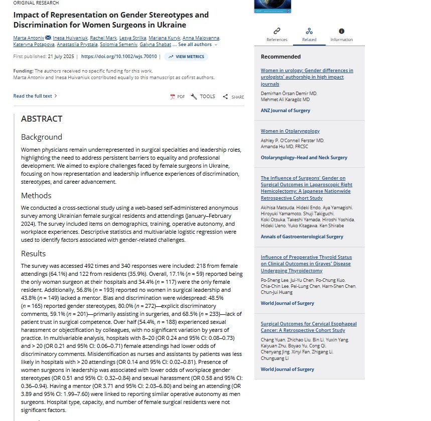 | Короткий огляд (реферат): | Women physicians remain underrepresented in surgical specialties and leadership roles, highlighting the need to address persistent barriers to equality and professional development. We aimed to explore challenges faced by female surgeons in Ukraine, focusing on how representation and leadership influence experiences of discrimination, stereotypes, and career advancement. |