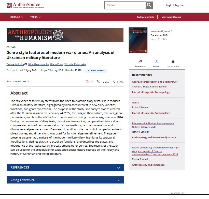 | Короткий огляд (реферат): | The relevance of this study stems from the need to examine diary discourse in modern Ukrainian military literature, highlighted by increased interest in new diary varieties, functions, and genre syncretism. The purpose of the study is to analyze diaries created after the Russian invasion on February 24, 2022, focusing on their nature, features, genre parameters, and how they differ from diaries written during the initial aggression in 2014. During the processing of diary texts, historical–biographical, comparative-historical, and complex elements of hermeneutical, structural methods, textual, correlation, and discourse analyses were most often used. In addition, the method of comparing subject–object planes, and dimensions, was used for functional genre refinement. The paper presents a systematic analysis of the modern military diary, highlights its structural modifications, defines static and acquired functions, and describes the status and importance of the latest literary process among other genres. The results of the study can be used for the preparation of basic and special lecture courses on the theory and history of Ukrainian and world literature. |