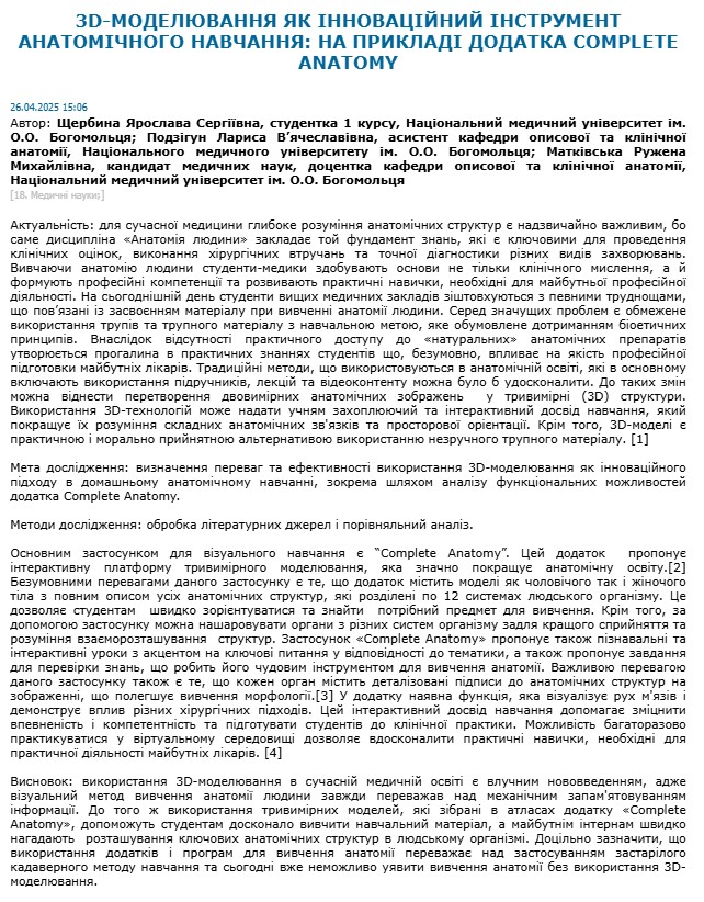 http://ir.librarynmu.com/handle/123456789/17463| Назва: | 3d-моделювання як інноваційний інструмент анатомічного навчання: на прикладі додатка Complete Anatomy |